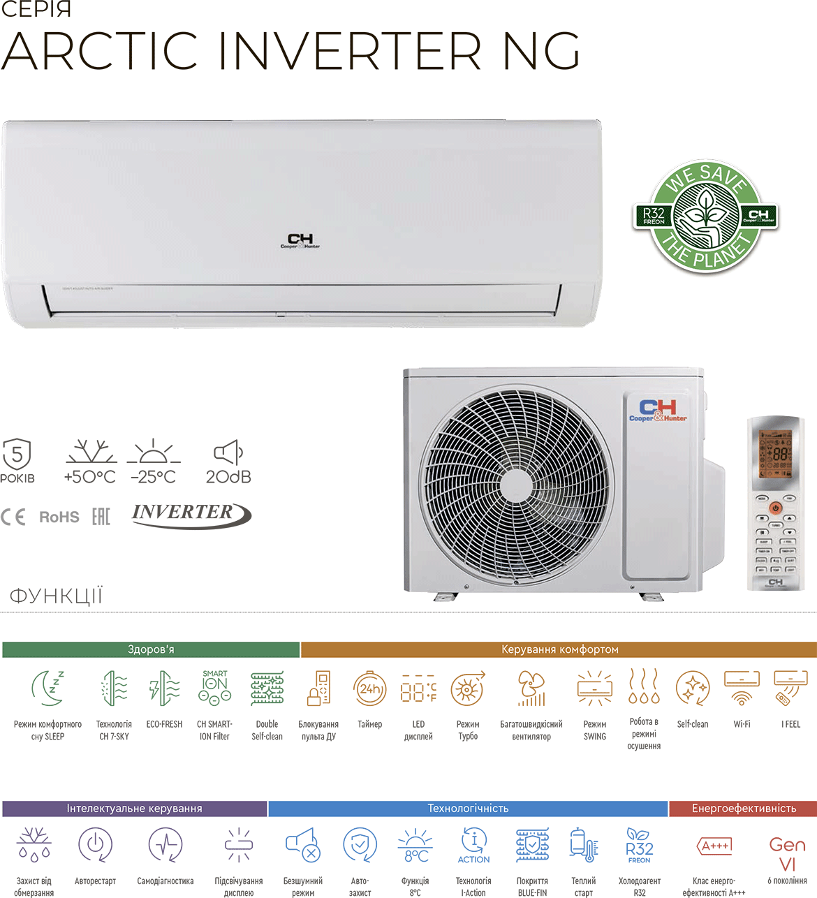 Инверторное управление. Премиальная комплектация Generation V (энергоэффективность класса А+++). «CH 7-SKY Technology» - комплексная система фильтрации на основе семи фильтров широкого спектра действия. «CH SMART-ION Filter» - технология тотальной очистки воздуха нового поколения. Самоочистка внутреннего блока. ; I Feel — встроенный датчик температуры в пульт ДУ. Многоскоростной вентилятор; Широкий воздушный поток; Экстра низкий уровень шума 20 дБ. Защита вашего дома от замерзания: функция «+8 градусов», режим «SLEEP», функция «Авторестарт»; Защита oт обмерзания наружного блока. Премиальный пульт дистанционного управления с ночной подсветкой и отображение текущего времени суток. Wi-Fi модуль, для возможности управления кондиционером через Смартфон/Планшет. Фреон R32. Работа до -25°С. Пр-во Гон-Конг. Гарантия 5 лет.