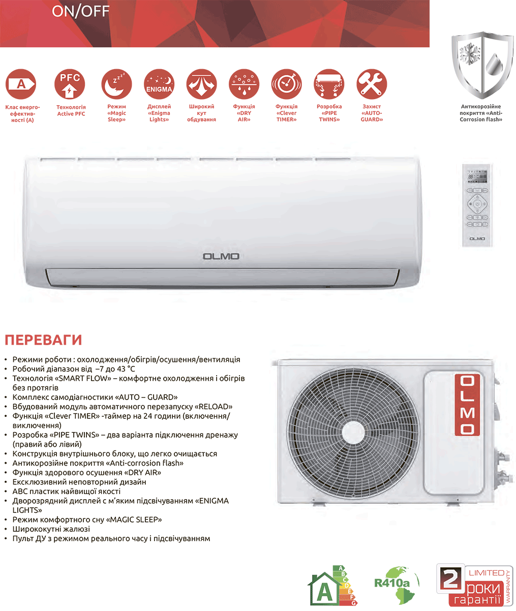 Кондиционер Olmo серия Leader. Обычный (не инверторный) компрессор, Робота на обогрев до -10°С, Енергоефективность класа А, Wi-Fi модуль опция (970 грн), Низкий уровень шума 25 дБ, Фреон R32, Пр-во Гонконг, Гарантия 2 года.