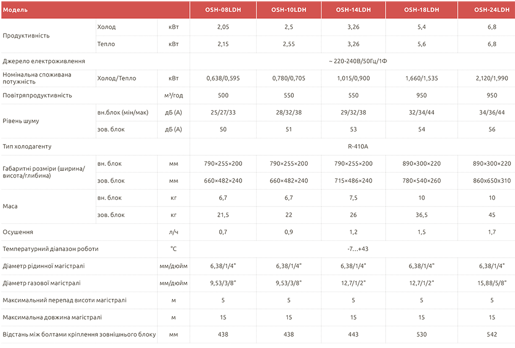 | Производительность обогрева 7/9/12/18/24 | 2.2/2.6/3,3/5.6/6.8 кВт |