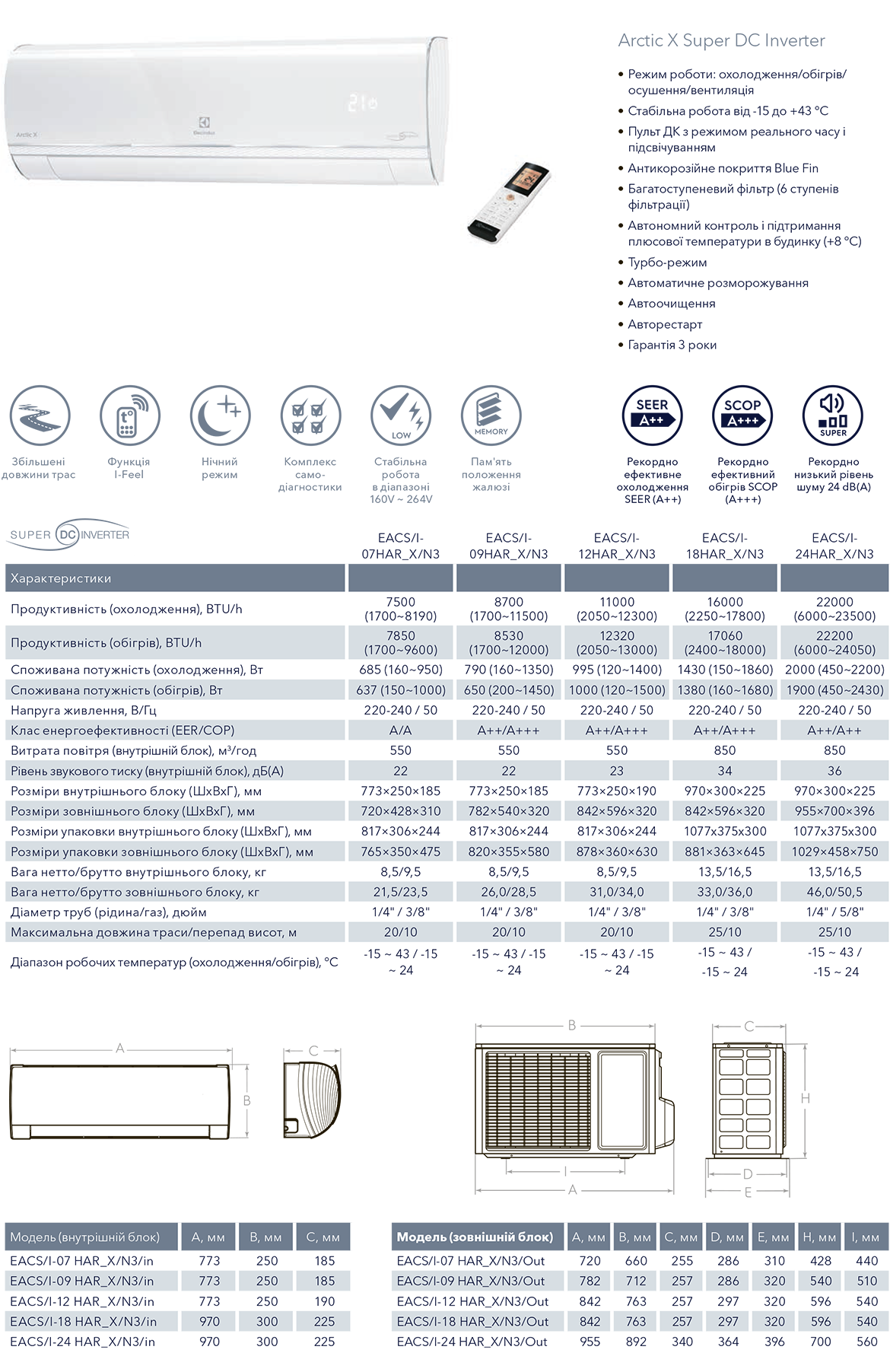 Кондиционеры Electrolux серии Arctic X Inverter холод/тепло. Авторестарт, мягкий старт, горячий старт, низковольтный пуск, низкотемпературный пуск, широкоугольные жалюзи, автоматическое качание вертикальных жалюзи, LED дисплей, пульт ДУ, таймер 24 часа, класс энергосбережения А++, защита от перепадов напряжения, низкий уровень шума, фотокаталитический+фильтр отрицательных ионов, турбо режим, ночной режим, авто режим, самодиагностика, автоочистка, автоматическая разморозка. Фреон R-410A. Пр-во Гонг-Конг. Гарантия 3 года.