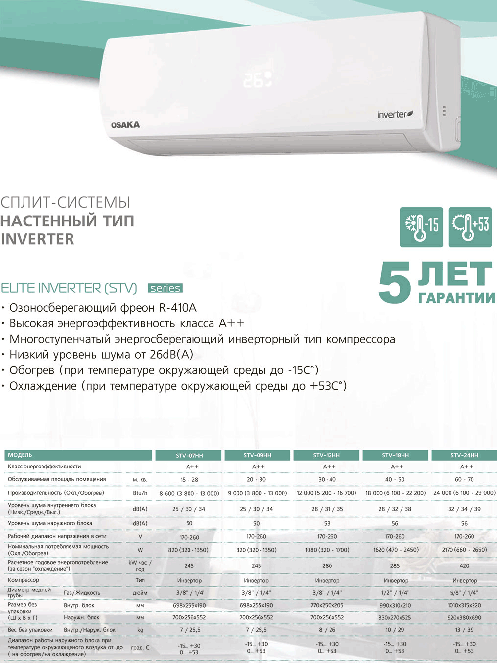 Кондиционер Osaka серии Elite. Инверторный компрессор, Энергоэффективность класса А++, Шум 25 дБ, Работа на обогрев до -15°С, Фреон R32, Пр-во Гонконг, Гарантия 5 лет.