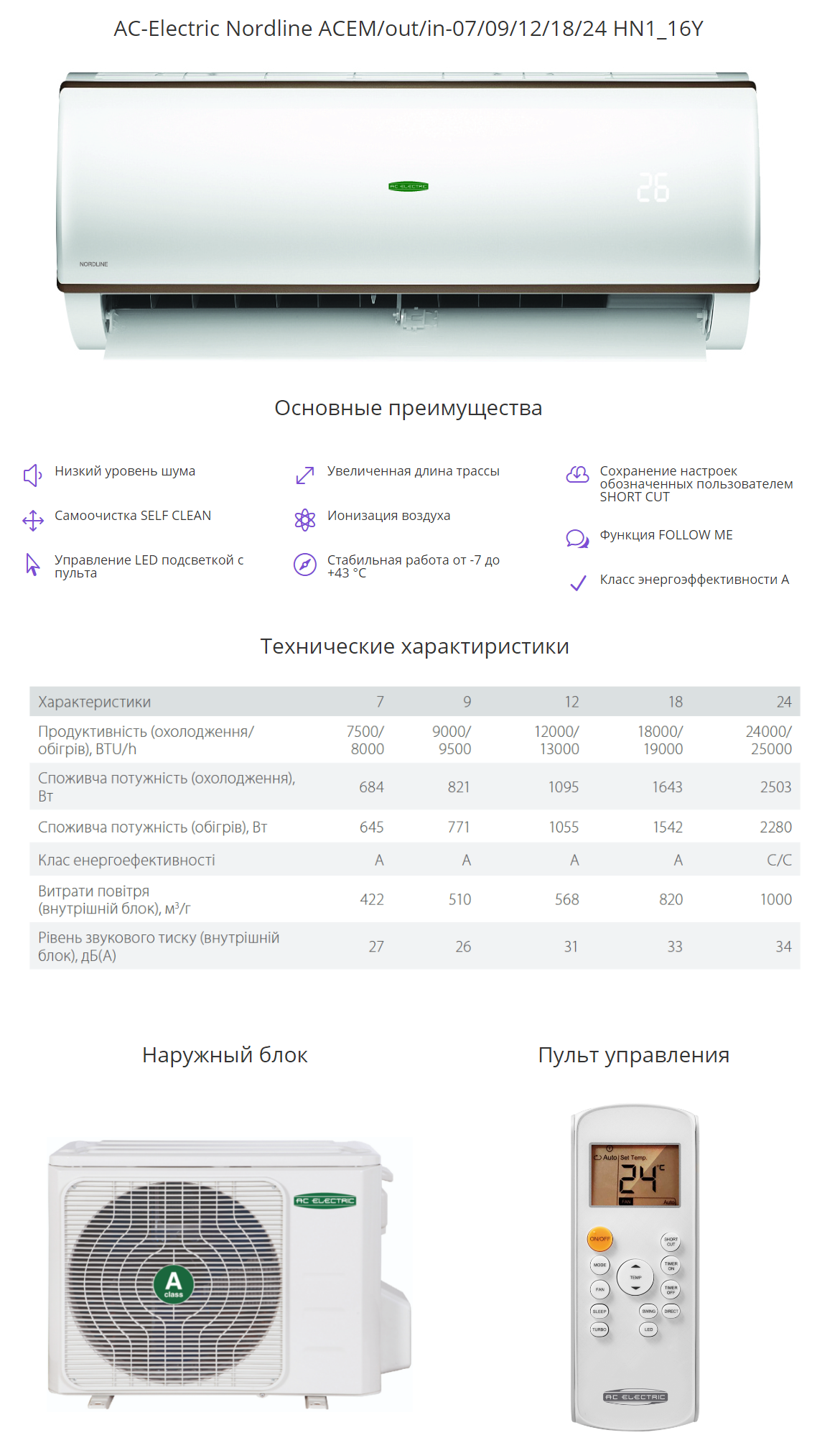 AC Electric серии NordLine. Авторестарт, мягкий старт, горячий старт, низковольтный пуск, низкотемпературный пуск, широкоугольные жалюзи, автоматическое качание вертикальных жалюзи, LED дисплей, пульт ДУ, таймер 24 часа, класс энергосбережения А, защита от перепадов напряжения, низкий уровень шума, турбо режим, ночной режим, авто режим, самодиагностика, автоочистка, автоматическая разморозка. Фреон R-410A. Пр-во Гонг-Конг. Гарантия 3 года.