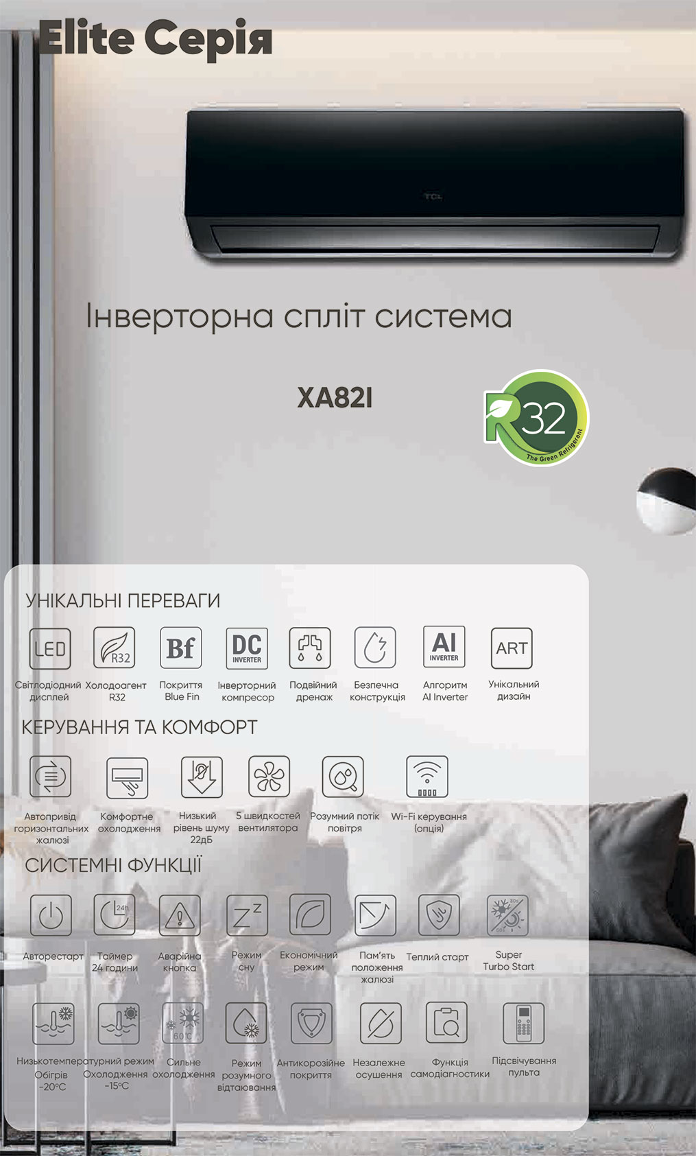 Кондиціонер TCL серії Inverter – вдале поєднання елегантності та сучасних технологій. Інверторне керування. Спліт-система забезпечена всіма необхідними режимами (охолодження, обігрів, осушення, вентиляція) та широким набором функцій: Timer, Авторестарт та Нічний режим. Енергоефективність класу А ++. Технологічна та конструктивна перевага цієї серії – автоматичні вертикальні та горизонтальні жалюзі, що дозволяють рівномірно поширювати повітря по приміщенню. Wi-Fi модуль, для керування кондиціонером через Смартфон/Планшет. Фреон R-32. Робота на обігріві до -20°С. Пр-во Гонг-Конг. Гарантія 3 роки.